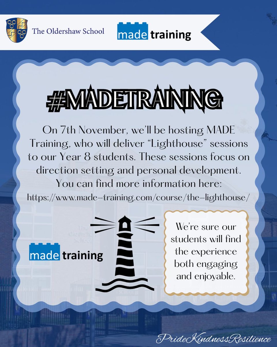 On 7th November we will have MADE training delivering sessions to Year 8 students- the sessions are called Lighthouse and are about direction setting- a link to the info is here: